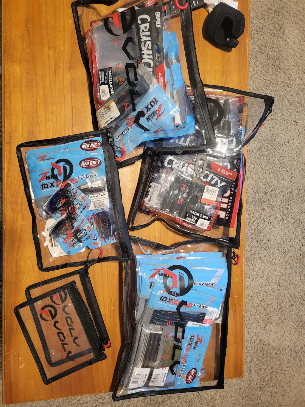 Large Bag: The large bag is approximately15.75"X12". It's perfect for storing soft plastics and anything else you want to keep organized and dry. Fits between 10-15 packs of soft plastics.